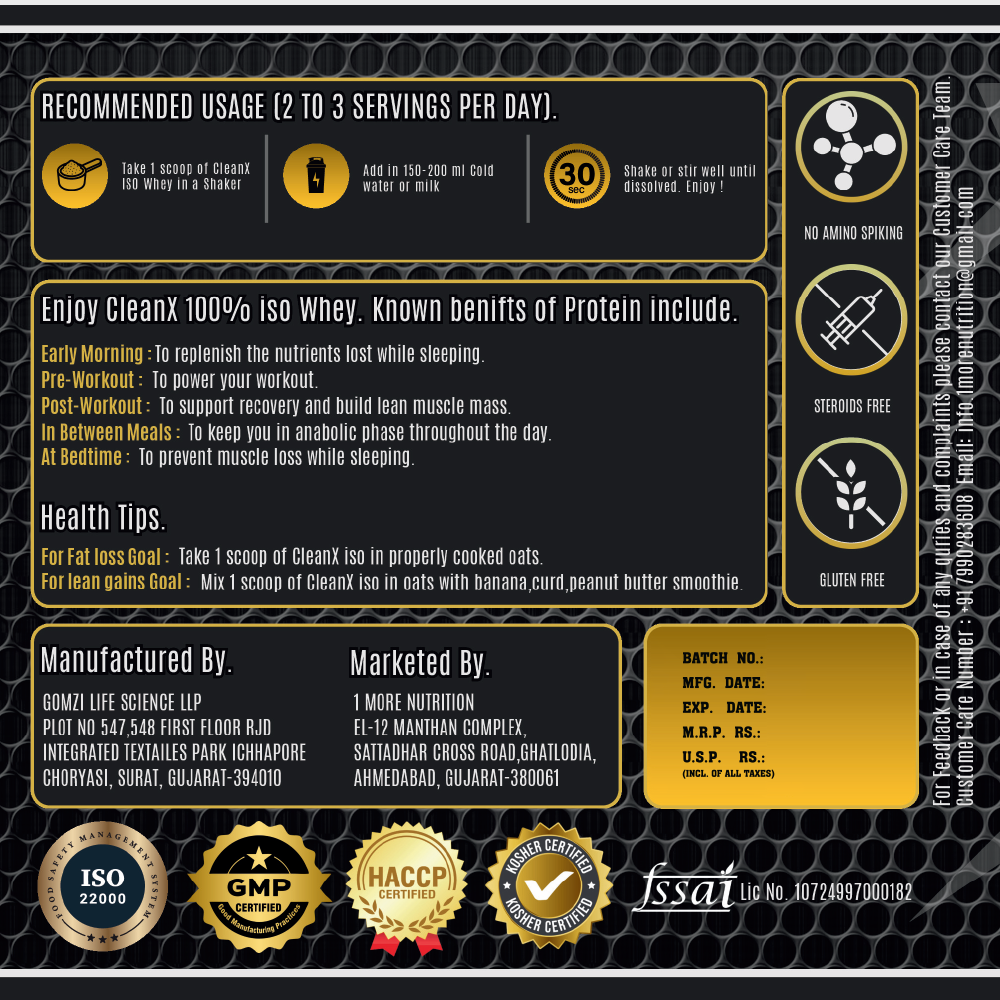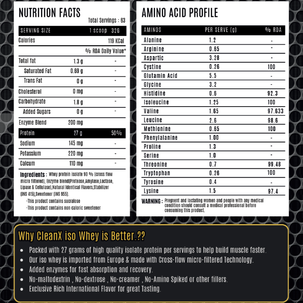Cleanx Nutrition Isolate Whey Protein is a Mixture of Whey Isolate, Whey Concentrate, Skimmed Milk powder, Soy protein isolate and plant protein. It is packed with 24g of 100% High Quality Isolate Whey Protein per serving (32g scoop). The benchmark and premium source of protein powders. Each serving delivers an excellent course of naturally occurring essential amino acids and Branch Chain Amino Acids (BCAA's). The protein found in Performance Whey Blend help support the growth and maintenance of lean muscle mass, ideal for everyone.